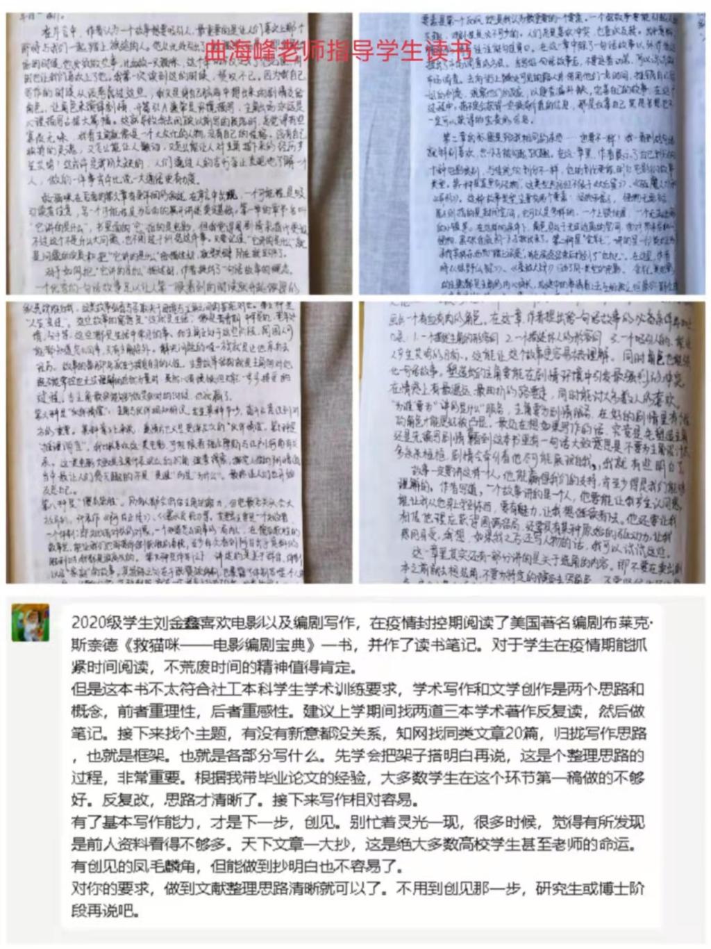 曲海峰老师围绕“横班纵组”同学提交的读书笔记,与学生进行了深入的讨论。曲老师肯定了学生们在疫情期间认真读书的学习态度,并指导学生如何选择专业书籍以及如何进行专业写作。