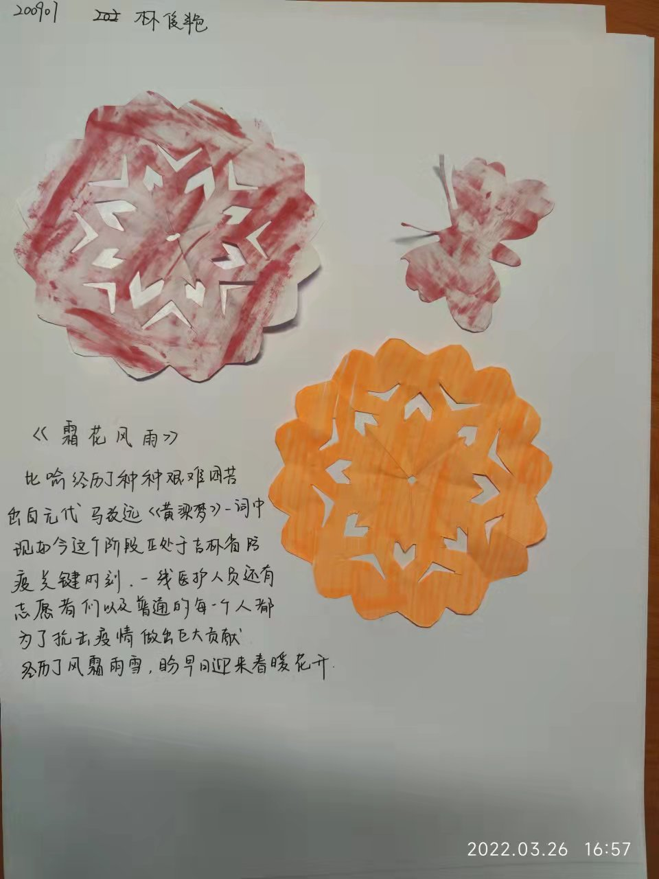 女同学们在徐经理的带领下,开展了以弘扬抗疫精神为主题的剪纸比赛。剪纸作为一种民间艺术,以其传承赓续的视觉形象和造型格式,蕴涵了丰富的文化历史信息,表达了人们的道德观念、生活理想和审美旨趣。女同学以自己特有的心灵手巧,将最朴素的愿望以剪纸的形式表现了出来。