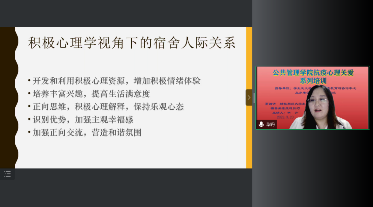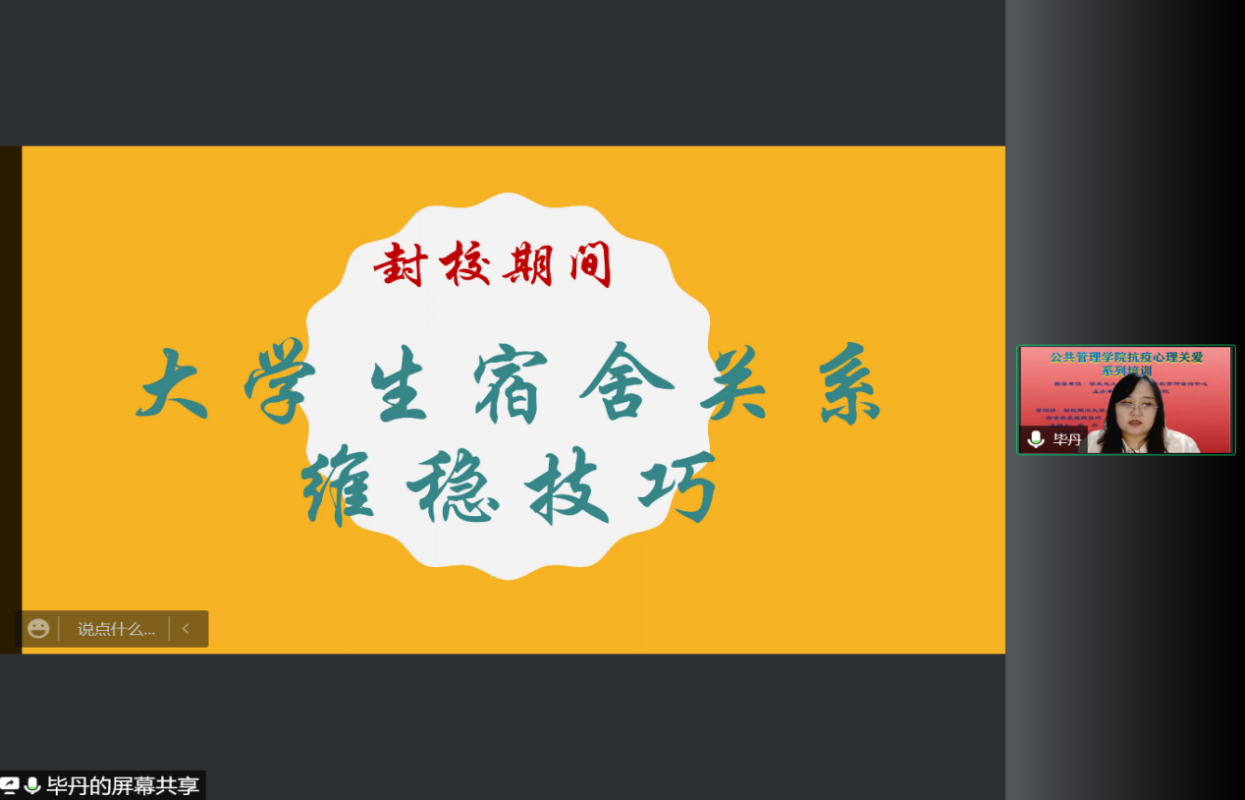 2022年3月20日晚,350vip8888新葡的京集团举办首轮抗疫心理关爱系列讲座第四讲。本次讲座以“封校期间大学生宿舍关系维稳技巧”为主题,主讲人是社会工作系的毕丹老师。