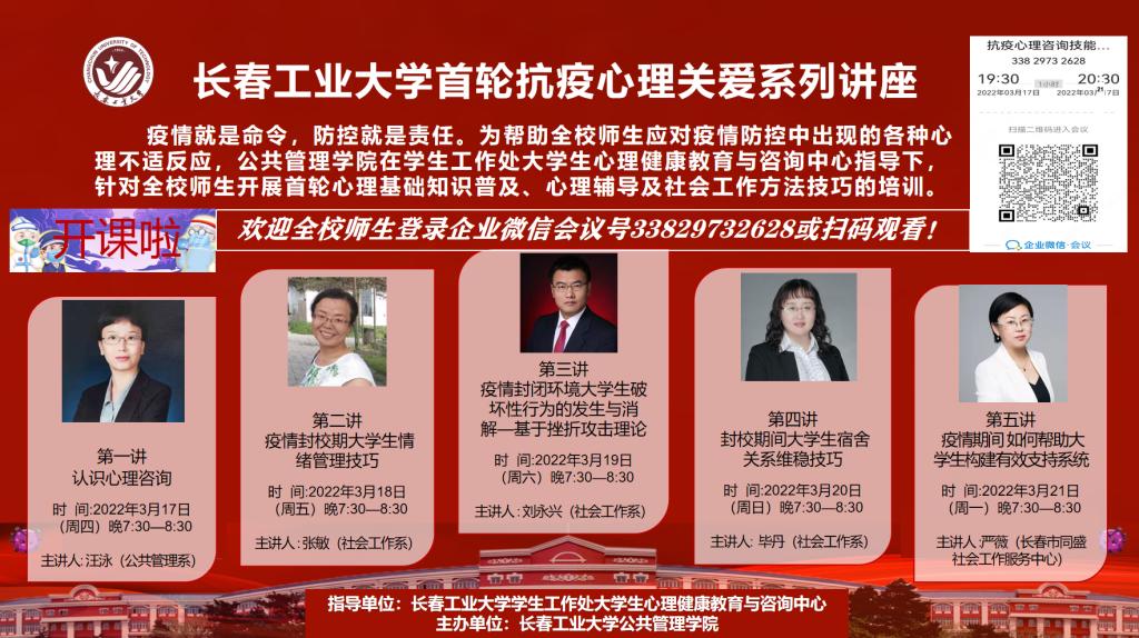 致辞中,韩小威院长介绍了本次系列讲座推出的背景,在当前全校上下齐心以防疫为第一要务、学校抗疫管控力度不断升级的情况下,为提升全校师生特殊时期心理应激状态的调节能力,为满足疫情不断变化以及学校长时间封闭可能造成的持续增长的心理关爱与支持需求,学院成立了以具有心理学专业背景教师为骨干、长期从事青少年心理关怀的社会工作专业师生为支撑的心理关爱志愿服务队,并在第一时间组织具有心理咨询与心理关爱服务经验的教师开展学校首轮抗疫心理关爱系列讲座。