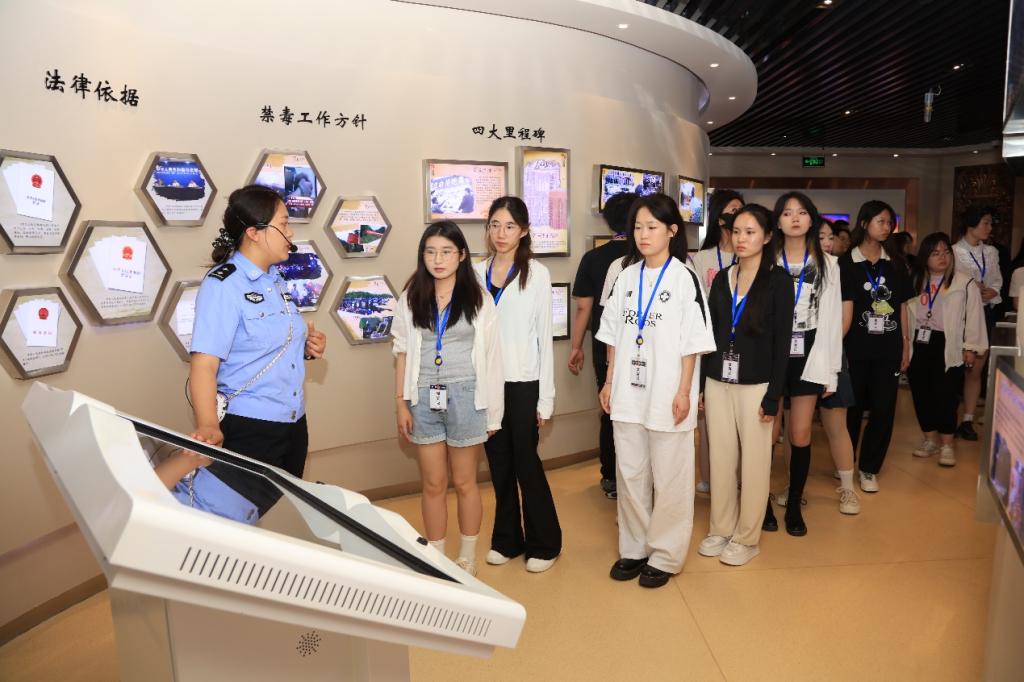 活动伊始,民警同志带领师生参观禁毒主题展厅。围绕中国禁毒历史,通过图片、视频、等多种形式展示我禁毒的历程,并通过3D投影等高科技手段为同学们介绍了毒品的危害。随后,同学们参观了康复训练中心、心理矫治中心、禁毒科技展馆。在各馆内都有互动项目,同学们积极体验,感受禁戒毒过程的艰难,极大增强了同学们的防范毒品意识。