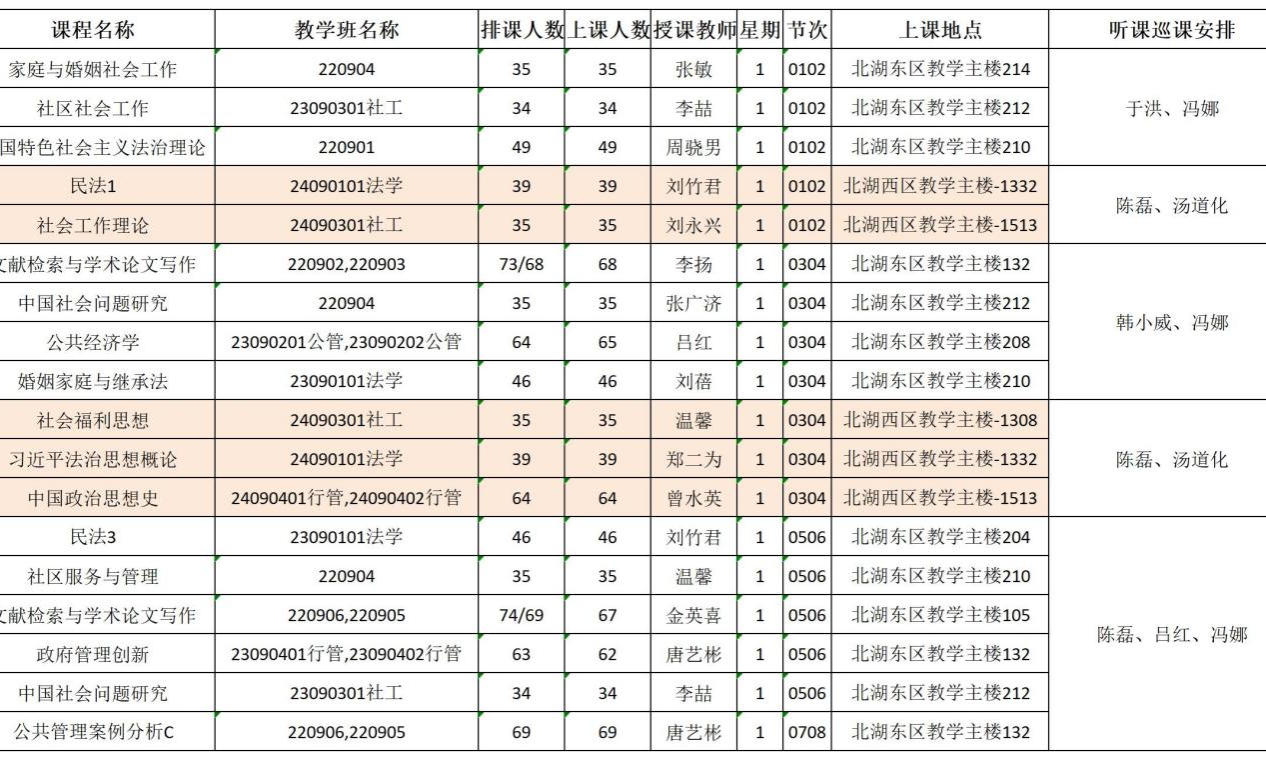 2025年2月24日为开课首日,全院上下紧密配合,各门课程顺利启动,共计18门课程开课,其中北湖东区13门,北湖西区5门,覆盖了法学、公共事业管理、社会工作、行政管理四个专业。开课首日开课情况一切正常,教学秩序井然。