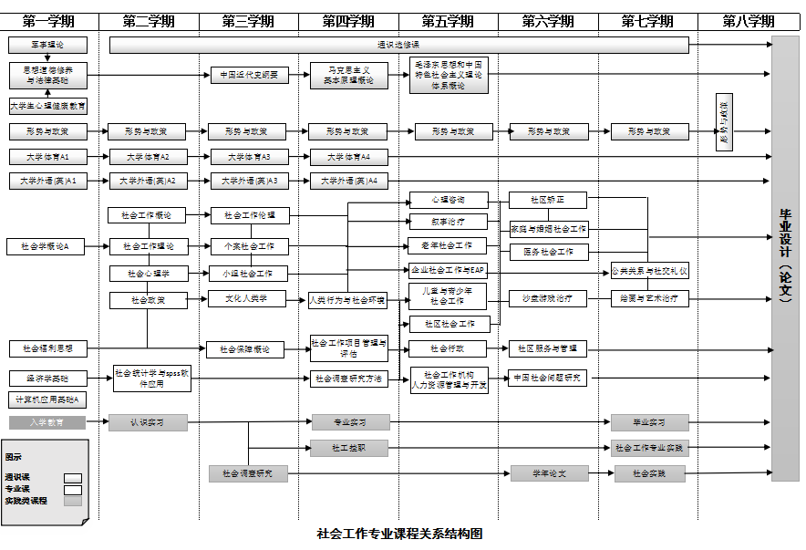 | 社会工作专业实践 | 4 | 总门数:7 总学分:14.25 周学时:18 实践周:12 |