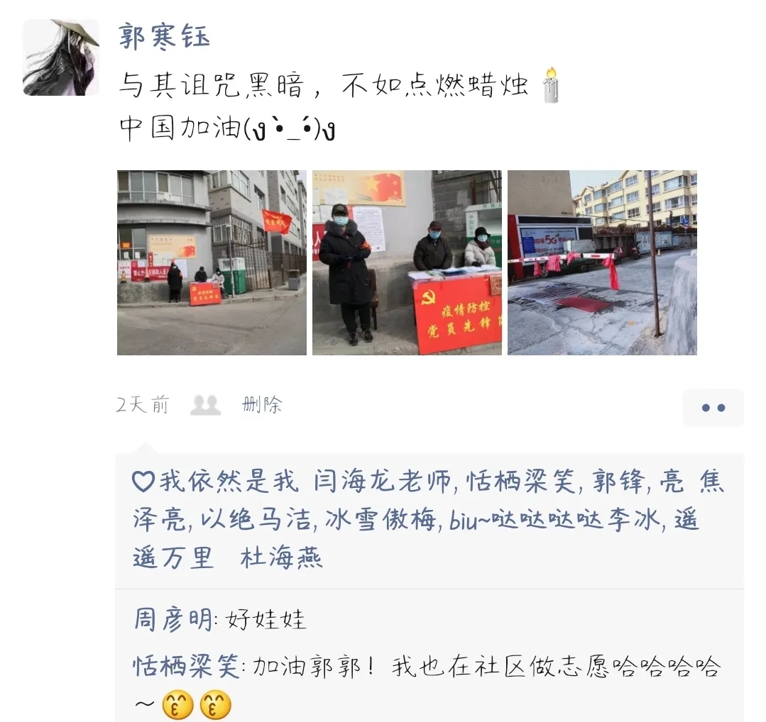 随着复工潮的到来,社区为方便人员进出和减轻志愿者的工作负担也想了一些办法,推出了扫二维码进出的方法。她凭借对于移动设备的熟悉,很快就为社区居民完成了登记,赢得了社区工作者的赞赏。在志愿者活动中郭寒钰用温和耐心的态度去解答居民的疑问,安抚他们的情绪,为社区营造一个良好氛围做出了贡献。她坚信没有一个春天不会到来,我们一定可以打赢这场防疫攻坚战!