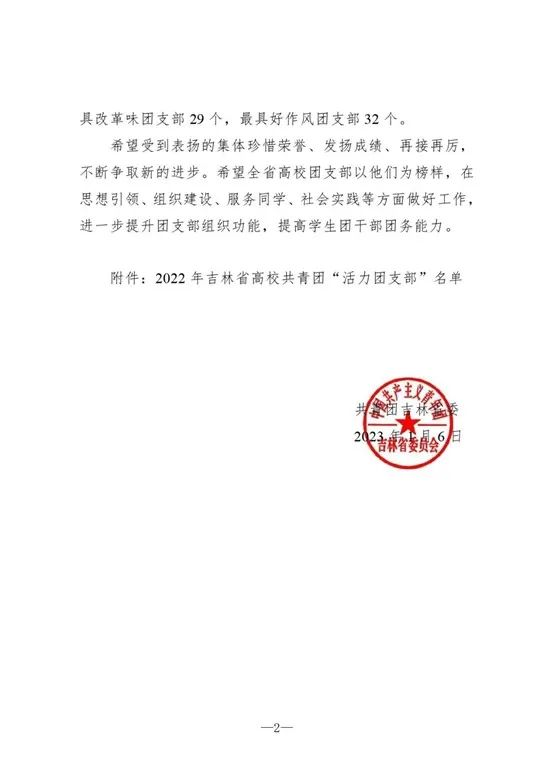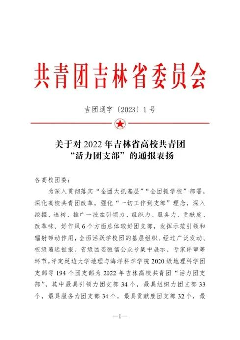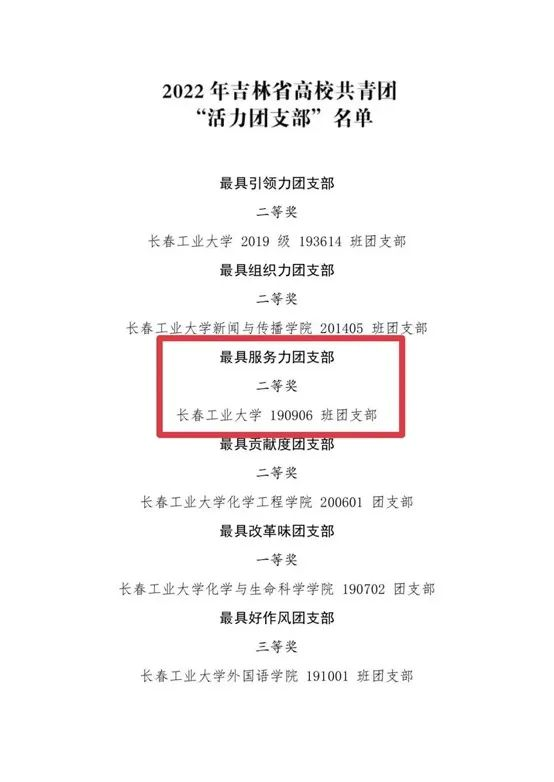 为深入贯彻落实“全团大抓基层”“全团抓学校”部署,深化高校共青团改革,强化“一切工作到支部”理念,深入挖掘选树,推广一批在引领力、组织力、服务力、贡献度、改革味、好作风6个方面总体较好团支部,发挥示范引领和辐射带动作用,全面活跃学校团的基层组织。在学校党委的正确领导下,350vip8888新葡的京集团团委积极进取,探索创新,在2022年吉林高校共青团“活力团支部”评选中,我院190906团支部荣获“最具服务力团支部”称号。