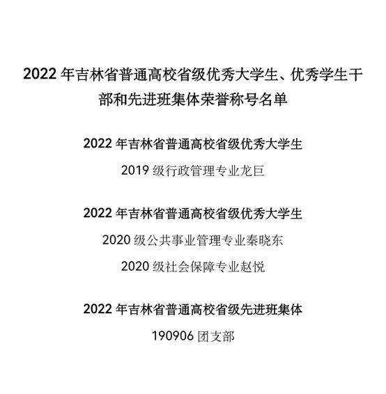 2022年,全省高校深入学习贯彻习近平新时代中国特色社会主义思想和党的二十大精神,全面贯彻党的教育方针,坚持立德树人根本任务,勇担为党育人、为国育才使命,培养德智体美劳全面发展的社会主义建设者和接班人,涌现出了一批优秀大学生、优秀学生干部和先进班集体。我院在此次评比活动中斩获佳绩,其中2019级行政管理专业龙巨荣获省级优秀学生干部称号,2020级公共事业管理专业秦晓东、社会保障专业赵悦获得优秀大学生称号,190906团支部获得省级先进班集体称号。