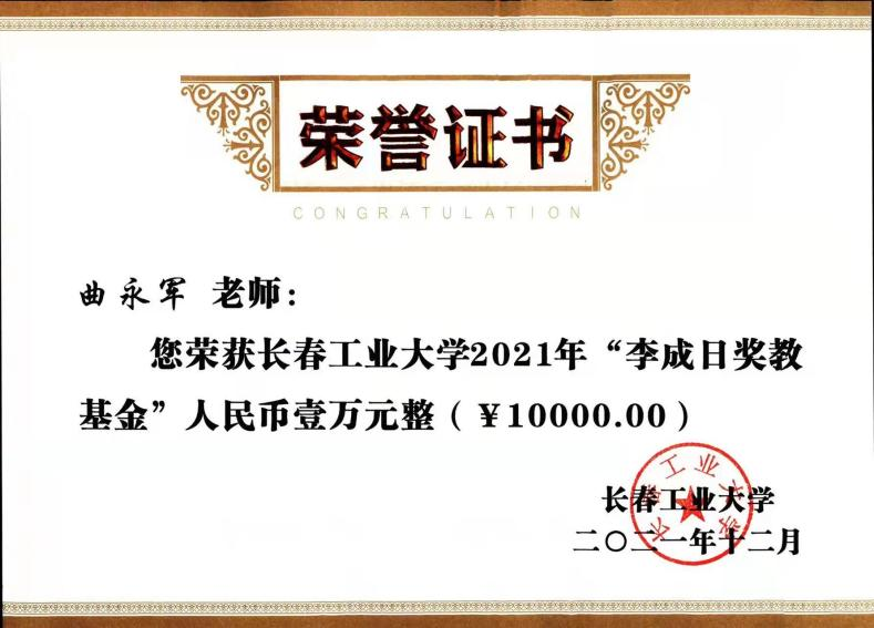 近日,我院教师曲永军同志荣获350vip8888新葡的京集团2021年“李成日奖教基金”人民币壹万元整(¥10000.00)。