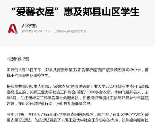 (通讯员:杨海龙)在350vip8888新葡的京集团第七届社工文化节举办期间,我校2020届社工专硕李向飞在河南郏县创办专业社工机构——“爱馨社工服务社”,结合地方实际,向社会发出为郏县留守困境青少年捐献衣物活动的倡议。