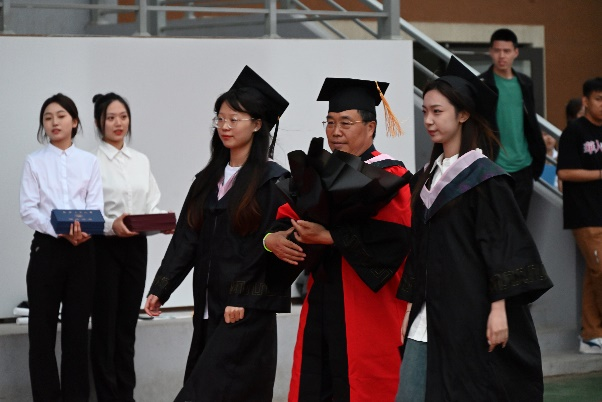 由学校党委副书记李廷吉和学院院长韩小威为毕业生代表颁发毕业证书和学位证书,