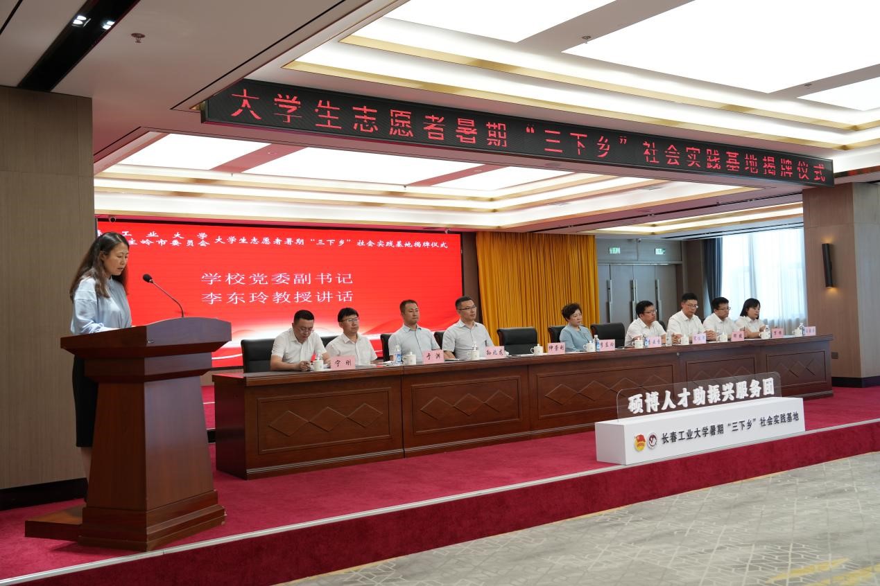 7月9日下午,校地共建大学生志愿者暑期“三下乡”社会实践基地揭牌仪式在当地举行。校党委副书记李东玲、公主岭市委副书记李云香出席仪式,公主岭团市委、教育局及辖区各街道有关人员,我校党委学生工作部、党委研究生工作部、团委及350vip8888新葡的京集团负责同志,部分专职团干部,实践团队大学生志愿者参加活动。