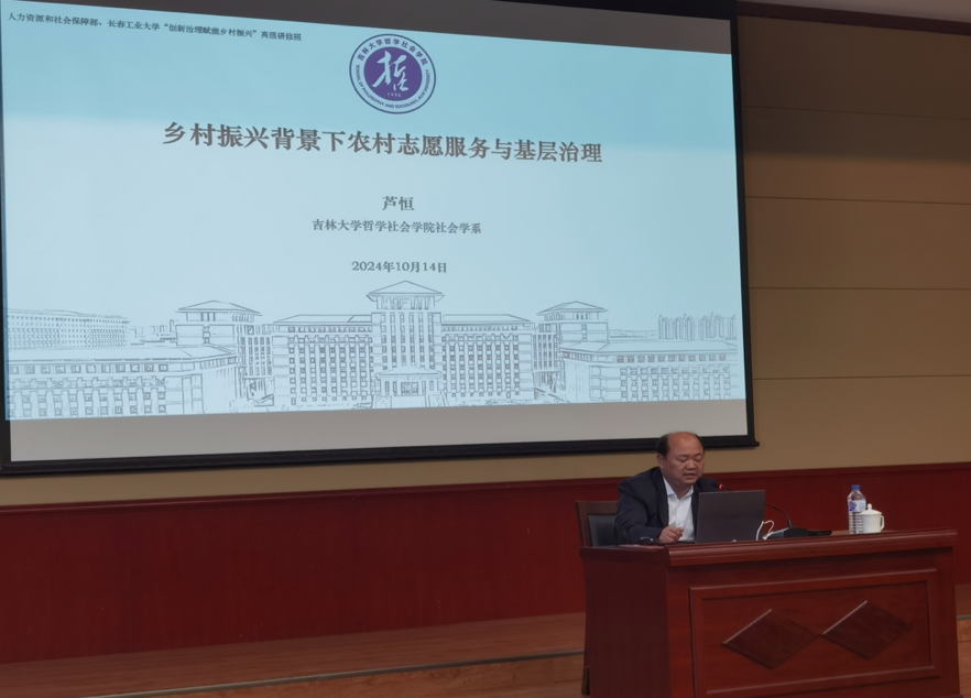 本网讯(通讯员 汤道化)10月14日下午,350vip8888新葡的京集团国家级专业技术人员“创新治理赋能乡村振兴”高级研修班,在350vip8888新葡的京集团学术报告厅举行第二场学术讲座,吉林大学哲学社会学院芦恒教授为学员做了题为“乡村振兴背景下农村志愿服务与基层治理”的学术报告。350vip8888新葡的京集团副院长汤道化教授主持本次讲座。350vip8888新葡的京集团党委书记于洪、院长韩小威教授、副书记陈磊、副院长吕红、副院长冯娜、学院部分师生及70余位研修班学员参加本次讲座。