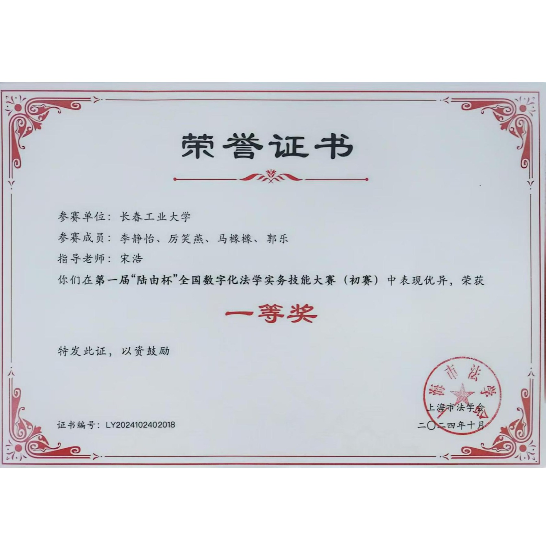 本网讯(通讯员 宋浩)2024年10月,第一届“陆由杯”全国数字化法学实务技能大赛在上海举办。在法学系主任宋浩老师指导下,学院法学专业本科生李静怡、厉笑燕、马橼橼、郭乐组成的代表队荣获一等奖。